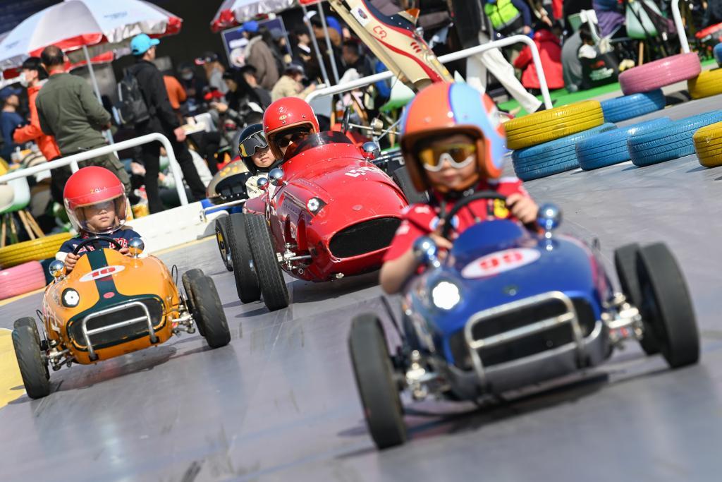 2026年3月14日,上海嘉定上赛场外的汽车文化节上,孩子们正体验“儿童卡丁车”项目。澎湃新闻记者 吴栋 图